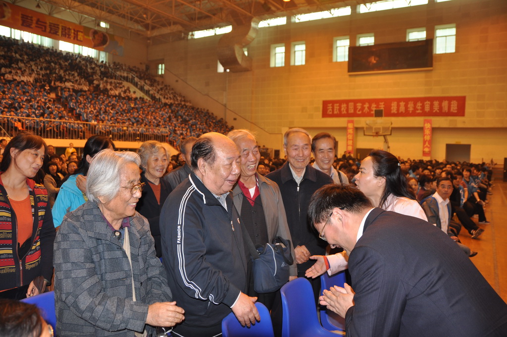 报告会后,谭校长还特地来到退休教师中间,向老教师们问好,并向老教师们鞠躬致敬。