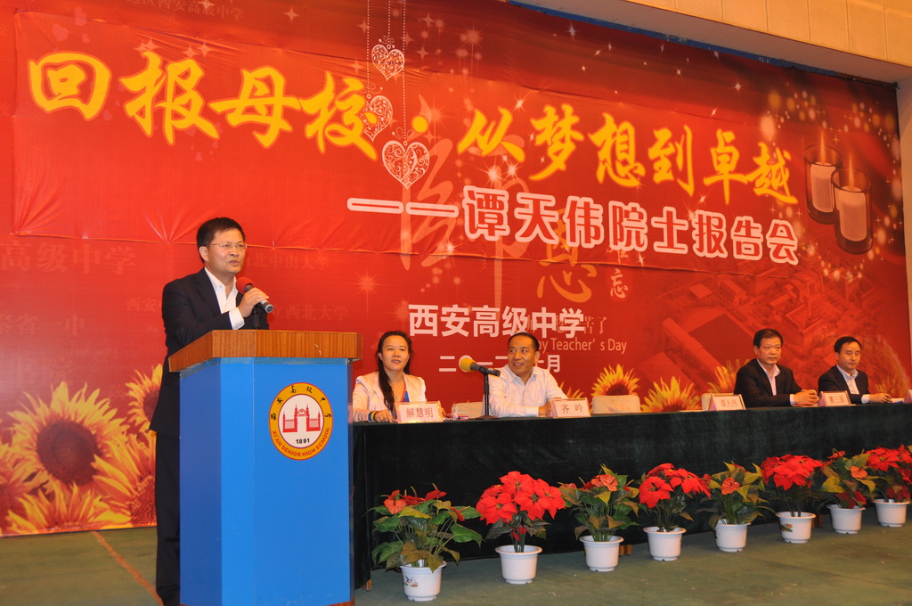 西安高级中学有121年的办学历史,是陕西省级重点中学、全国知名重点中学,也是谭天伟校长的母校。他为母校师生作了题为“回母校,从梦想到卓越”的专题报告。报告中回顾了他在西安高级中学学习的经历,介绍了他在大学期间和参加工作后在生物化工领域做科研的历程,并与现场学生展开互动,耐心解答同学们的提问,赢得现场阵阵掌声。
