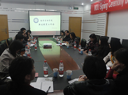 10月24日,经济管理学院新生教育工作会在东区图书馆一楼会议室召开。经济管理学院党委书记冯婕,院长余乐安,副书记张馨,副院长李冬冬、李健,各系主任,2012级各班班主任和辅导员参加了会议。会议由分党委副书记张馨老师主持。