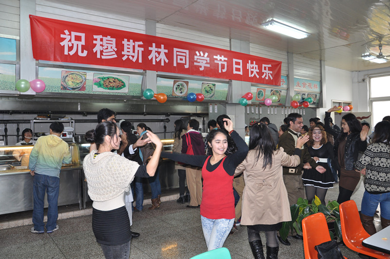 古尔邦节是我国回族、维吾尔族等信仰伊斯兰教少数民族的传统节日,是一年中最盛大的节日之一。26日中午,清真食堂里悬挂起节日祝福的条幅,布置着色彩斑斓的气球和饰品,播放着欢快喜庆的民族舞曲,摆放着学校为同学们精心准备的糕点和水果,同学们脸上挂着喜悦的笑容载歌载舞,相互问候节日快乐,清真食堂里处处洋溢着喜庆祥和的节日气氛。