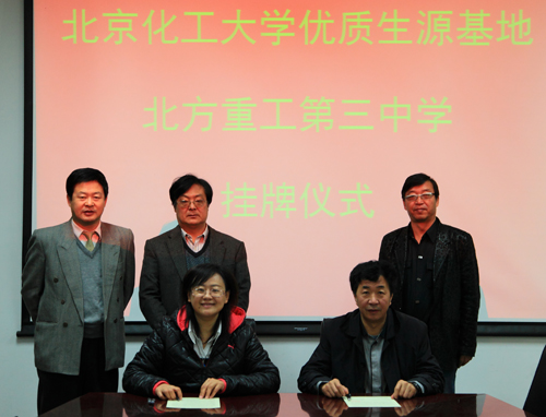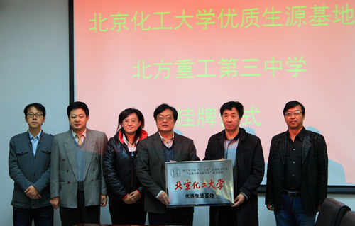 10月31日,北方重工第三中学副校长刘惠刚、艺体中心主任朱志刚访问我校,并与我校签署“北京化工大学-北方重工第三中学‘优质生源基地’协议”。理学院分党委书记白守礼、副院长许家喜、招生办主任赵静参加签约及挂牌仪式。