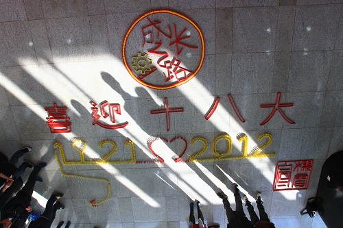 11月1日上午,“无碳小车”成果展示在东校区科技大厦举行。展示借助独特而古老的多米诺骨牌,由高金吉院士亲自启动无碳小车。随着骨牌逐级被推倒,最终一幅“喜迎十八大,1921—2012”的图案展现在大家面前,表达了对党的十八大胜利召开的美好祝愿。精彩的展示过程也赢得了在场师生的阵阵掌声。无碳小车是学生利用所学专业知识自主设计、制造并完成的无外加驱动力的机械装置,高院士对于同学们表现出的良好专业素养和独特的科技创新能力表示肯定,并鼓励同学们积极参与更多的科技创新活动。