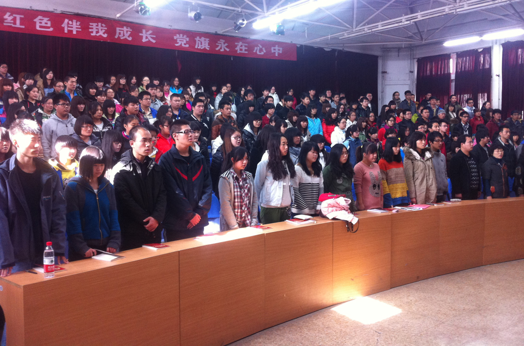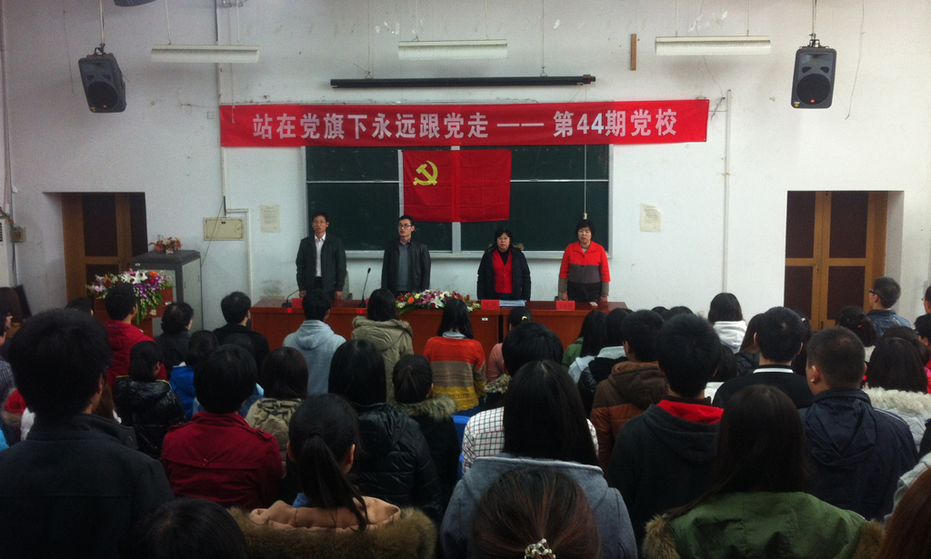 庄严肃穆的《国际歌》拉开了典礼的序幕。庞然副部长致词,他对同学们来到党校学习表示祝贺,向同学们详细讲述了党的发展历程和党的优良传统,并希望同学们在以后的学习生活中以党员的标准严格要求自己,不断深化党性修养,争取早日加入党组织。44期党课学员代表李辉发言,他对学校提供本次学习机会表示感谢,并表明在今后的学习过程中会认真学习党的理论知识,积极参与讨论和实践活动。学生党员代表赵翊宏发言,她结合自己的经历讲述了自己在入党的路上对党的认识不断加深的过程,并就十八大精神的学习过程畅谈了自己的感想以及坚定信念跟党走的信心。她希望学员们通过党校培训,能够端正入党动机,切实提高自身党性修养,不断深化党的理论知识学习,积极主动地向党组织靠拢。