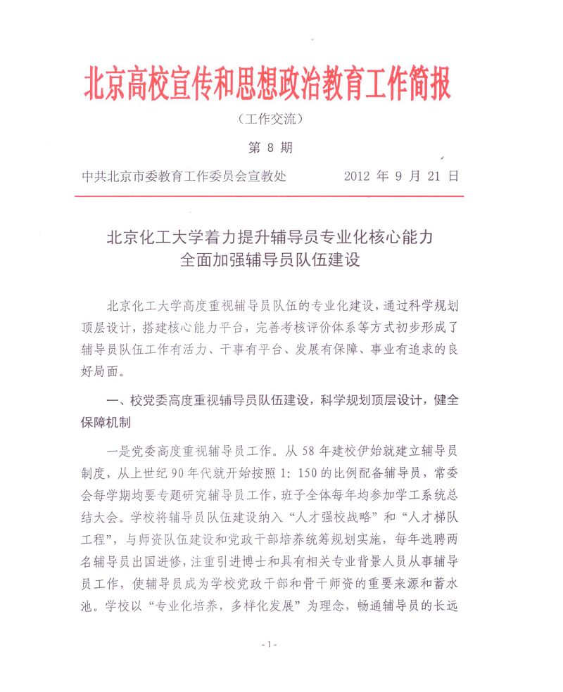近日,继教育部加强和改进大学生思想政治教育工作简报专题报道了我校辅导员队伍建设经验之后,北京高校宣传和思想政治教育工作简报(第8期)又以《北京化工大学着力提升辅导员专业化核心能力,全面加强辅导员队伍建设》为题专题介绍了我校辅导员队伍建设典型经验。
