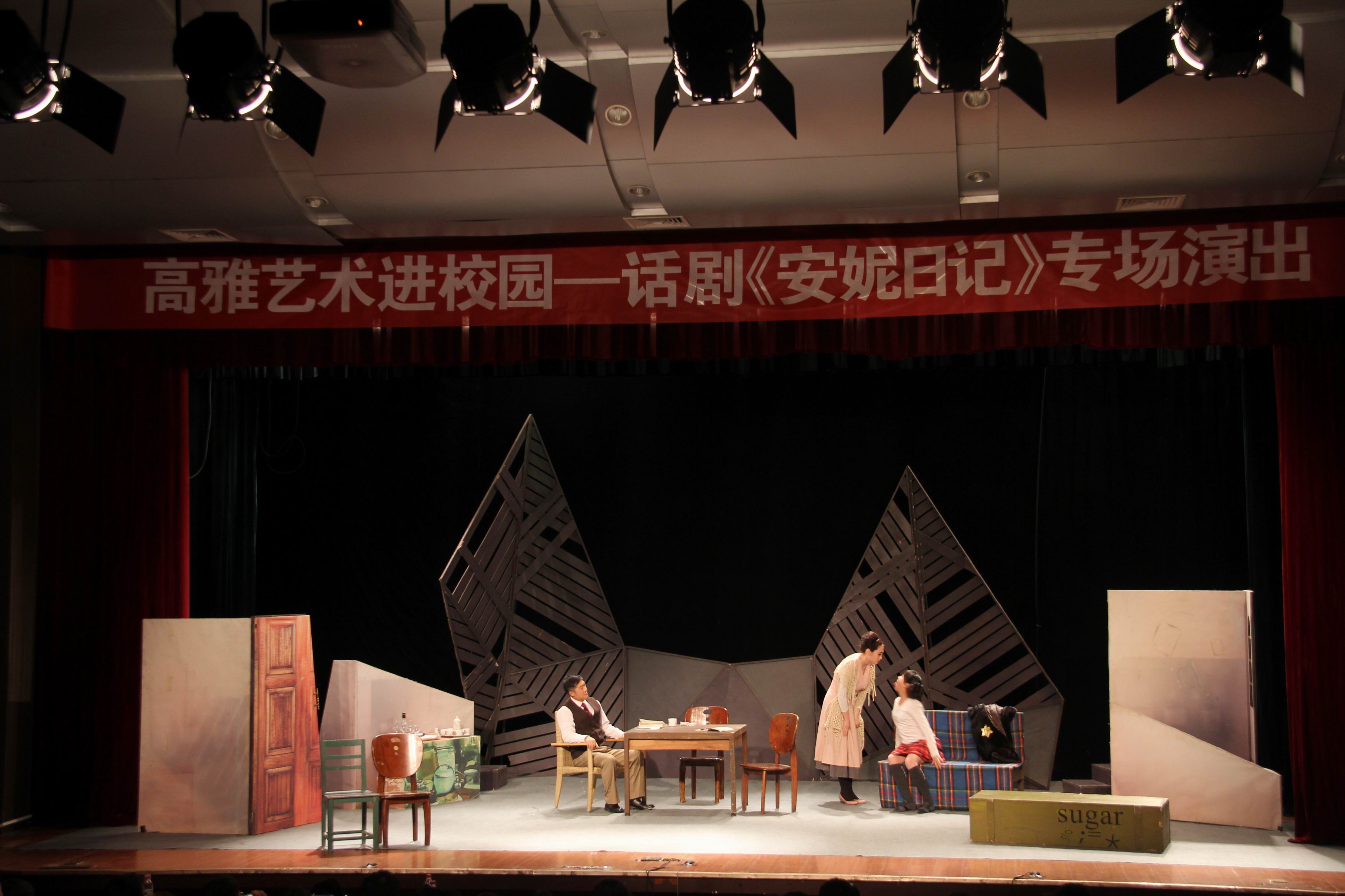 11月18日、19日晚,由校团委和吴朱红戏剧工作室主办,校学生会承办的“高雅艺术进校园——话剧《安妮日记》专场演出”在科学会堂上演。千余名师生观看演出。