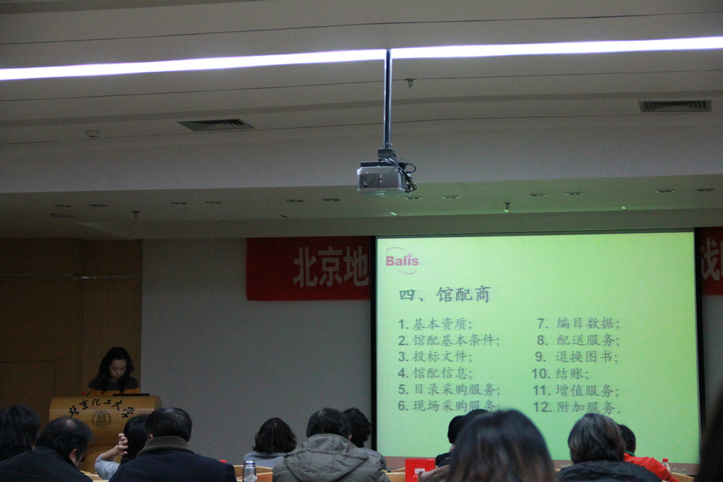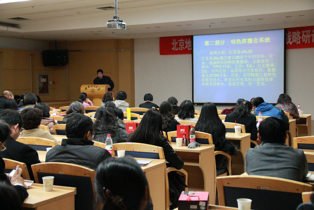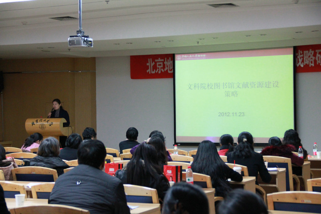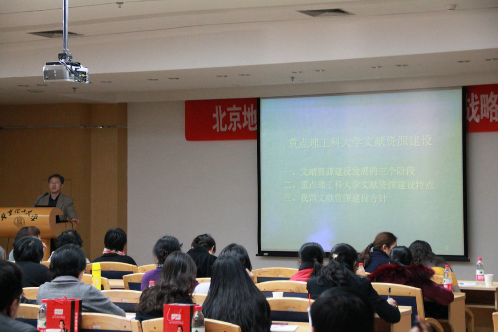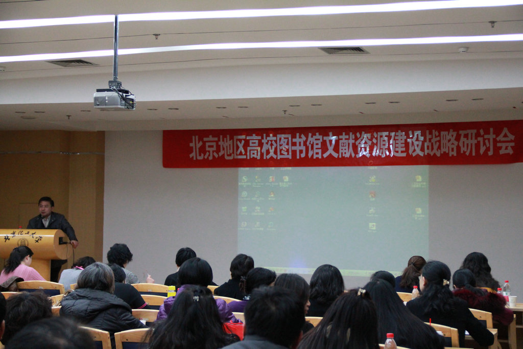 会议就中文图书馆配工作及文科、理工院校图书馆的文献资源建设策略进行研讨,同时介绍了文献资源服务平台软件。首都师范大学图书馆副馆长熊丽、中国人民大学图书馆副馆长刘春鸿、我校图书馆副馆长杨守文、及北京人天书店有限公司数字资源部技术总监滕敬合分别作了题为“《高校图书馆中文图书馆配工作指南》解读”、《文科院校图书馆文献资源建设策略》、《理工科院校图书馆文献资源建设策略》、《图书馆文献资源服务平台及相关软件》的报告。
