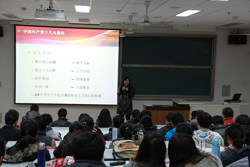 汪雪琴副书记同大家一同学习党的十八大会议报告精神。她结合许多实际案例为党员和入党积极分子上了生动的一课,提醒大家务必要坚定政治信仰,提高思想觉悟,加强自我要求,结合自身和社会的发展认真学习贯彻十八大精神,并对全体党员提出更高的学习要求和期望。