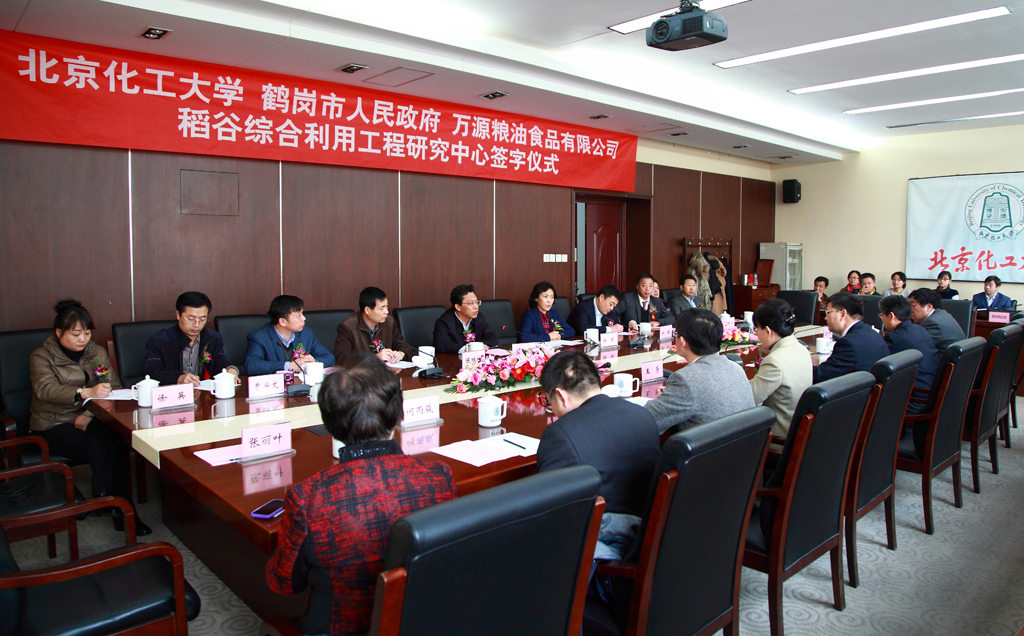 11月27日上午,黑龙江省鹤岗市市委副书记、市长张雨浦,市委常委、副市长徐颖等市政府相关领导,万源粮油食品有限公司董事长房泽纲及相关工作人员一行访问我校。校党委书记王芳,校长谭天伟,副校长王峰与鹤岗市政府领导一行举行会谈,探讨双方在粮食深加工领域的合作,并与鹤岗市人民政府、万源粮油食品有限公司签署“关于共建稻谷综合利用工程技术研究中心(院士工作站)的框架协议”。