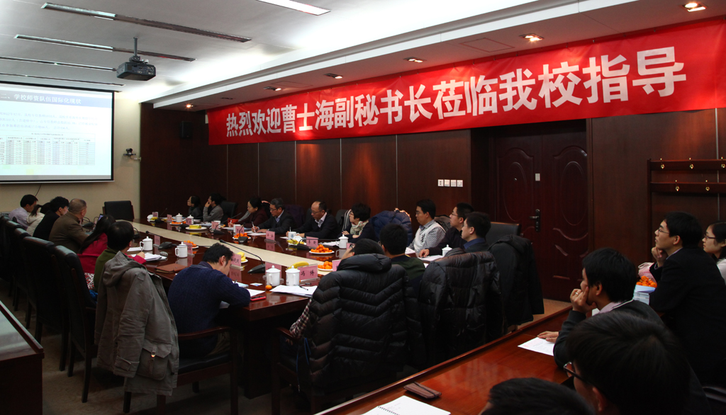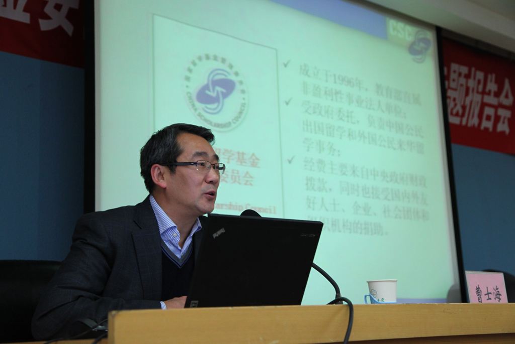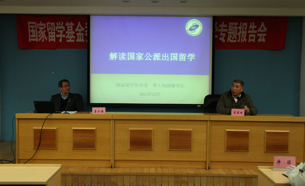12月11日下午,国家留学基金管理委员会副秘书长曹士海,规划发展部主任龙嫚,魏莉,副主任李昕、袁君,信息资源部主任吴华以及相关项目主管一行15人访问我校视察指导工作。曹士海副秘书长为我校师生作题为“解读国家公派留学”的专题报告,并与我校领导及相关部门负责人进行座谈。副校长李显扬、国际交流与合作处处长耿海萍、人事处副处长刘广青、研究生院副院长孙晓明,以及公派出国留学工作相关负责人与一百五十余名教师学生一起听取曹士海副秘书长的专题报告。报告会由副校长李显扬主持。