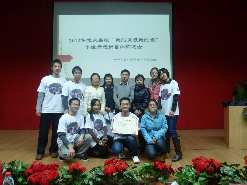 12月15日,由北京市委教育工作委员会举办的2012年北京高校“我的班级我的家”优秀班集体创建评选活动在北京大学举行。我校环工1004班凭借优异的成绩和精彩的现场展示,从参加答辩的20个北京高校班级中脱颖而出,荣获“十佳示范班集体”称号。