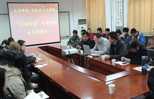 为迎接市安全教育工委,市教委来校进行“平安校园”创建工作验收,贯彻落实学校安全工作会议精神,3月14日,文法学院、马克思主义学院组织召开“平安校园”创建工作动员部署会。会议邀请保卫处处长许运清进行指导,两个学院的党政主要领导、系部负责人安全员及学生代表共同参加。