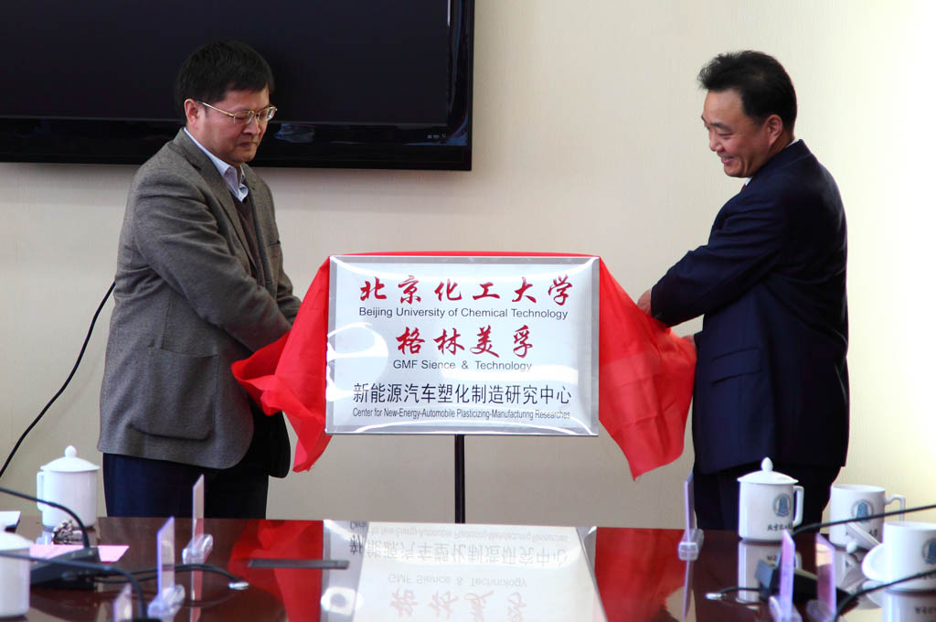 谭天伟校长与胡建国副市长共同为新成立的“新能源汽车塑化制造研究中心”揭牌。根据协议,格林美孚公司与我校联合成立“新能源汽车塑化制造研究中心”,格林美孚公司向我校教育基金会捐赠资金,用于支持该平台在我校所在地的建设和运行,双方依托该研究中心开展相关具体项目的研究和开发。
