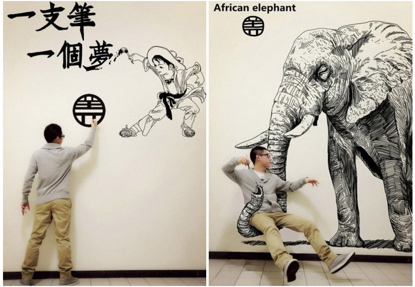 那么这些漫画是怎样制作出来的呢?盖括说,虽然作品的最终效果是在墙面上,但却是在绘图板上进行创作的。“我先在脑海中构思一个场景,想象一下自己在这个场景下应该是什么表情,然后摆姿势、拍照。之后就将构思好的场景还原到画板上,再通过软件将自己与漫画合成到一起”虽然听起来简单,但真要创作出优秀的作品却着实不易,尤其是盖括有着追求完美的性格,遇到不满意的地方就需要一遍遍地去修改。这些漫画,可谓是倾注了盖括大量的心血与情感,“但能跳进漫画成为主角,是我一直以来的梦想,即使付出再多的努力也是值得的。”