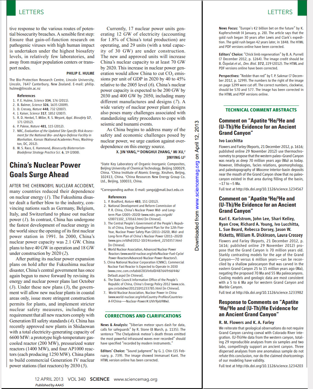 4月12日,我校化学工程学院环境科学与工程系杨晓进教授及其合作者在《Science》发表快报《China's Nuclear Power Goals Surge Ahead》。文章从能源安全的角度叙述了我国核电发展的现状、长期目标和方向:福岛核泄漏之后,欧美等国家纷纷减缓核电发展速度,我国及时调整核电发展步伐,稳步实施积极的核电发展规划和目标---在内陆地区不再审批和新建核电设施,新建核电站必须达到第三代核电技术的安全标准,到2020年核电装机容量将达到70GW,2030年实现第四代核电站的商业化运行。大力发展核电是缓解我国能源危机,实现CO2减排的重要举措,但各国的核泄漏事件也迫使我们思考更严格的核电安全标准。该文对我国能源结构发展和环境安全具有重要的指导意义。