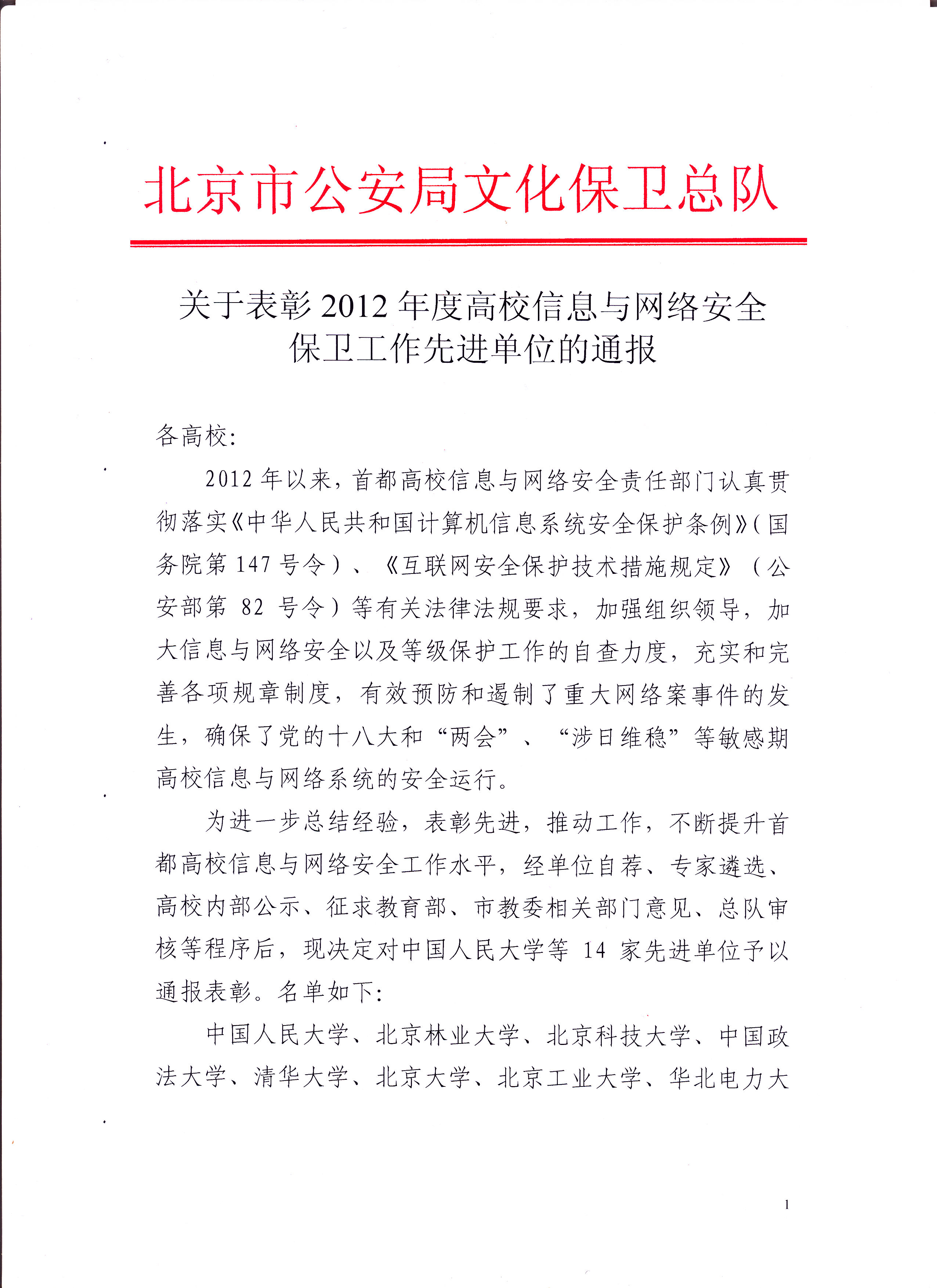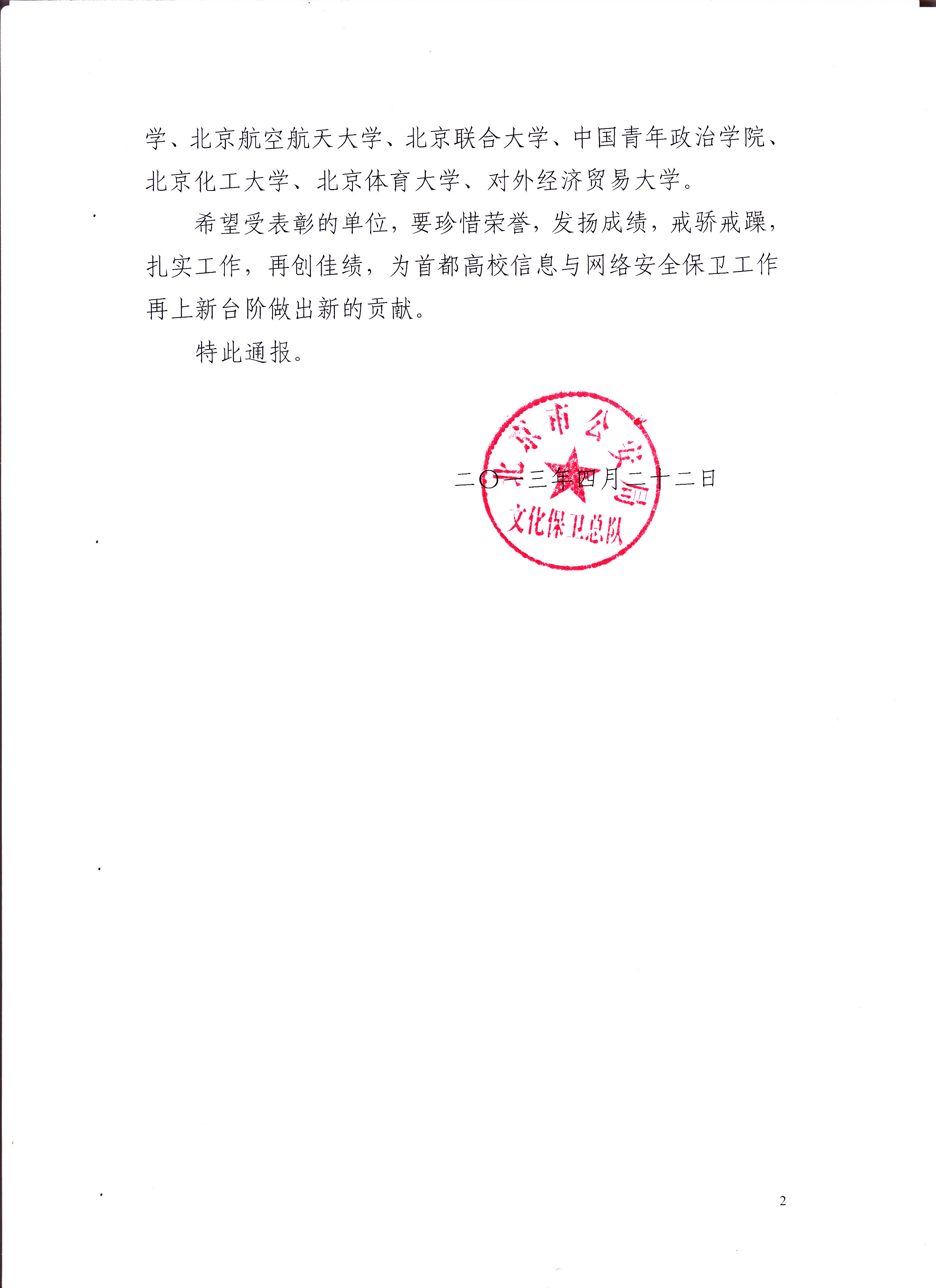 4月22日,北京市公安局文化保卫总队发布通告,对北京化工大学等14所高校予以通报表彰。