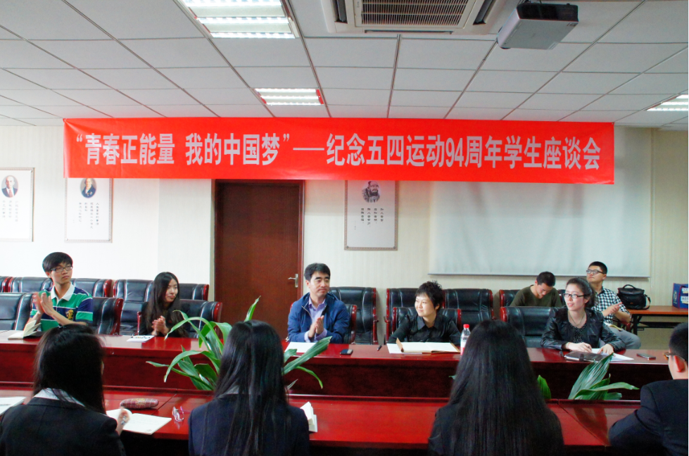 为纪念五四运动94周年,激励广大学生为实现中华民族伟大复兴的中国梦而努力奋斗,在党的十八大之后第一个五四青年节到来之际,我校举行“青春正能量 我的中国梦”--纪念五四运动94周年学生座谈会。学生工作办公室主任商云龙、校团委书记邹立娜,学生代表40余人参加了座谈会。