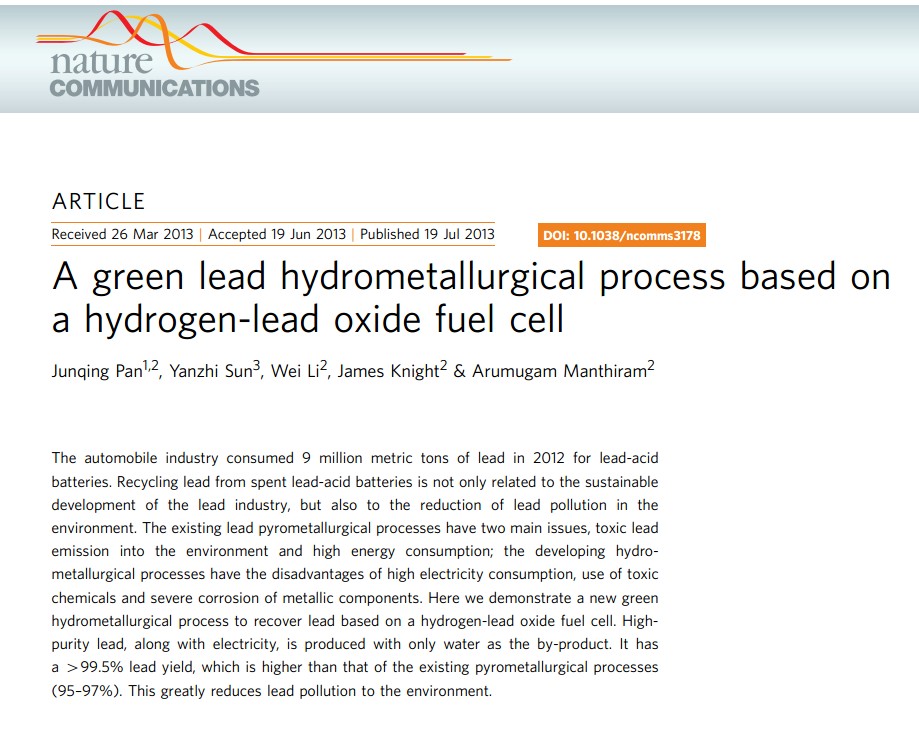 我校理学院潘军青教授围绕化工资源有效利用重点实验室的特色研究方向,在废弃汽车铅酸电池和铅矿石的含铅资源高效利用方面取得了重要的原创性研究成果,于7月19日以6页全文(Article)的形式发表在Nature 子刊——Nature Communications上。
