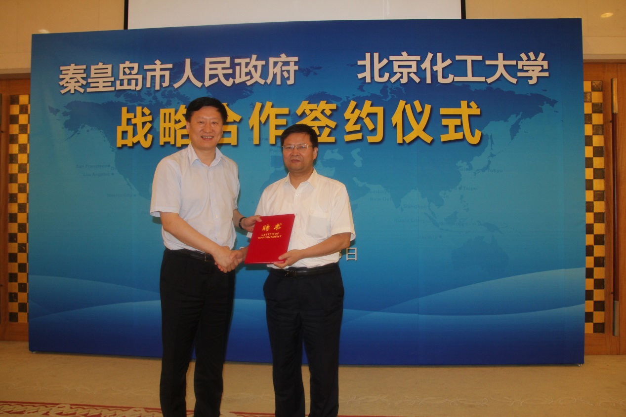 商黎光市长和王芳书记分别在仪式上致辞,表达了签订全面合作战略协议、加强校企合作、促进成果转化、实现双方共赢的共同愿望。谭天伟校长与商黎光市长代表双方签订了北京化工大学与秦皇岛市政府的战略合作协议。商市长还代表秦皇岛市政府聘请谭天伟院士为市政府顾问。