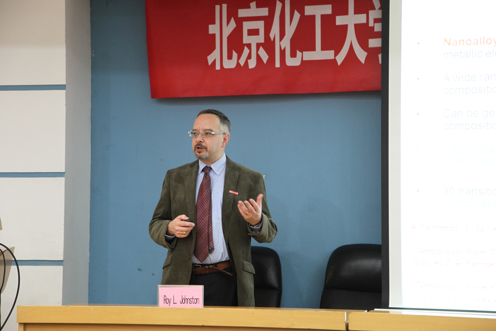 聘任仪式结束后,Roy L. Johnston教授为我校师生作题为“Nanoalloys: Two Metals Can be Better than One at the Nanoscale”的学术报告。报告介绍了一种定义良好、结构和特性可控的纳米材料——双金属纳米团簇。通过改变双金属纳米团簇的成分、原子排序以及集群的大小,可以得到不同物理化学特性的催化材料,以此为基础,就可以筛选出我们所需要的性能良好的催化剂。Johnston教授还报告了双金属纳米团簇在金纳米团簇具体研究进展。最后,Johnston教授耐心回答了老师与同学们提出的问题。