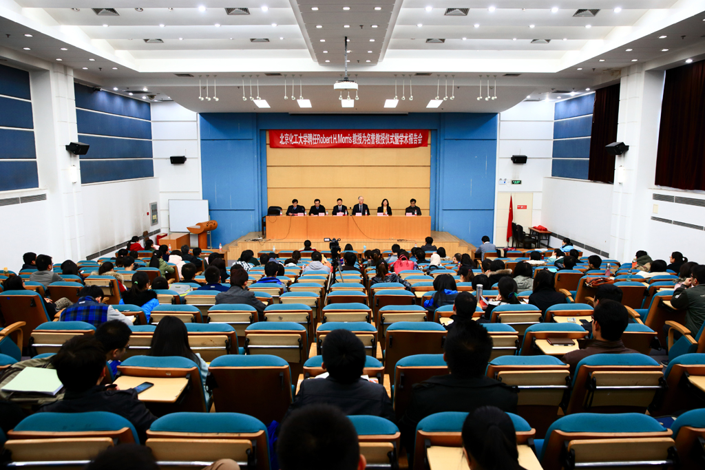 李殿卿院长首先介绍加拿大皇家科学院院士(FRSC)、加拿大多伦多大学杰出教授Robert Morris的简历及研究成果。谭天伟校长向Robert Morris教授颁发名誉教授聘书,学生代表向Morris教授献花并佩戴校徽。