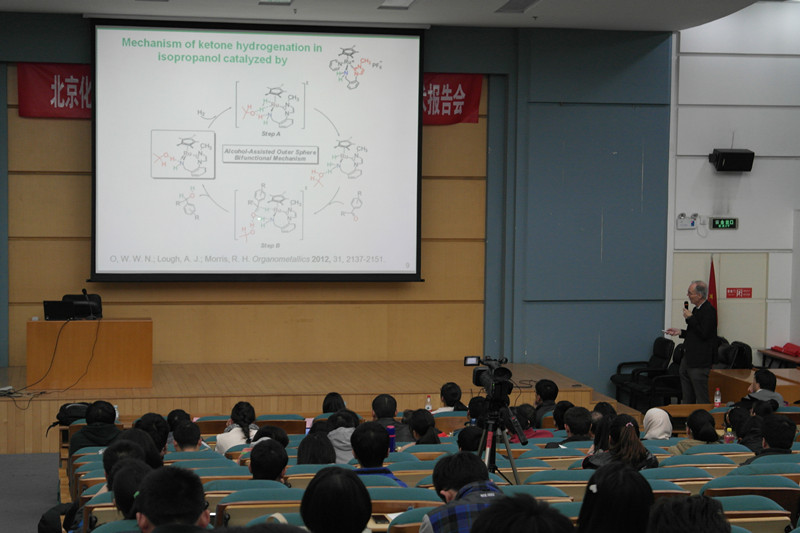 聘任仪式结束后,Morris教授为我校师生作题为“Developing Iron Catalysts for the Efficient Asymmetric Transfer Hydrogenation of Ketones and Imines”的报告。Morris教授从不对称的酮/胺氢化反应课题的研究背景出发,介绍了他们组在开发具有高活性选择性的不对称酮/胺氢化催化剂领域的研究成果。随后Morris教授耐心回答了老师与同学们提出的问题,现场气氛热烈活跃。