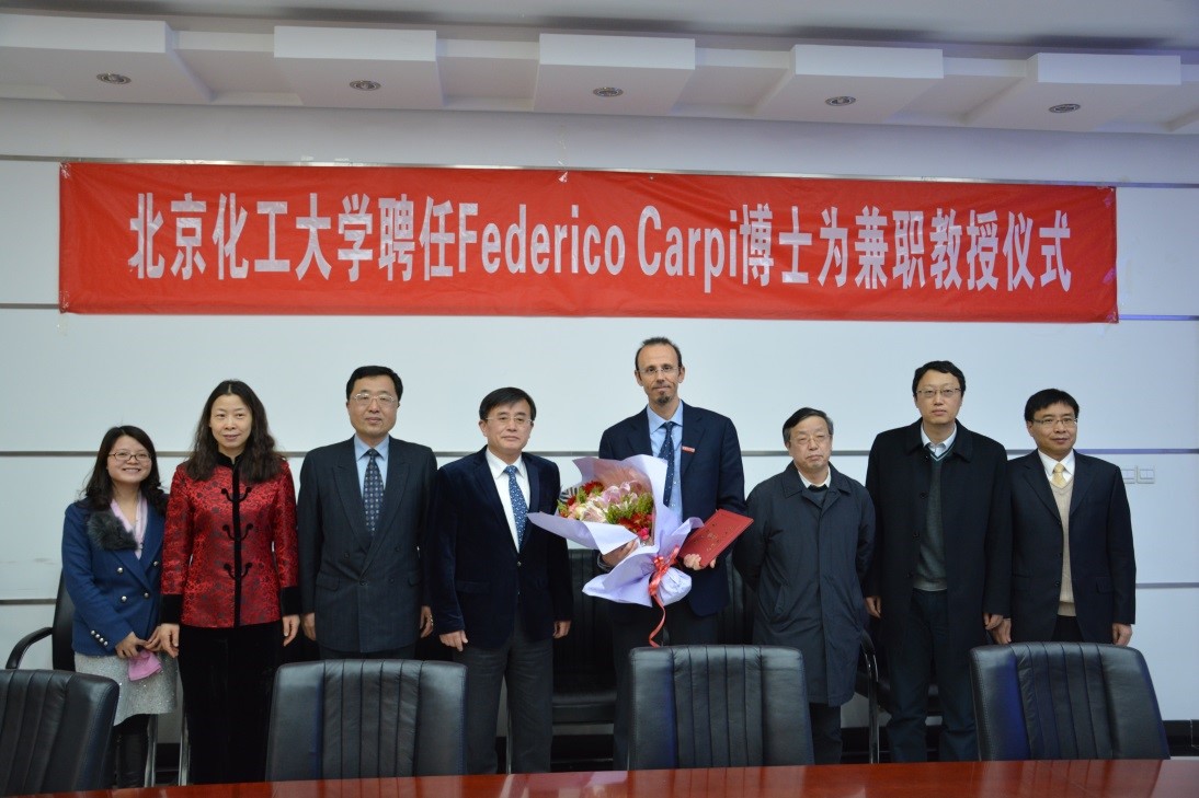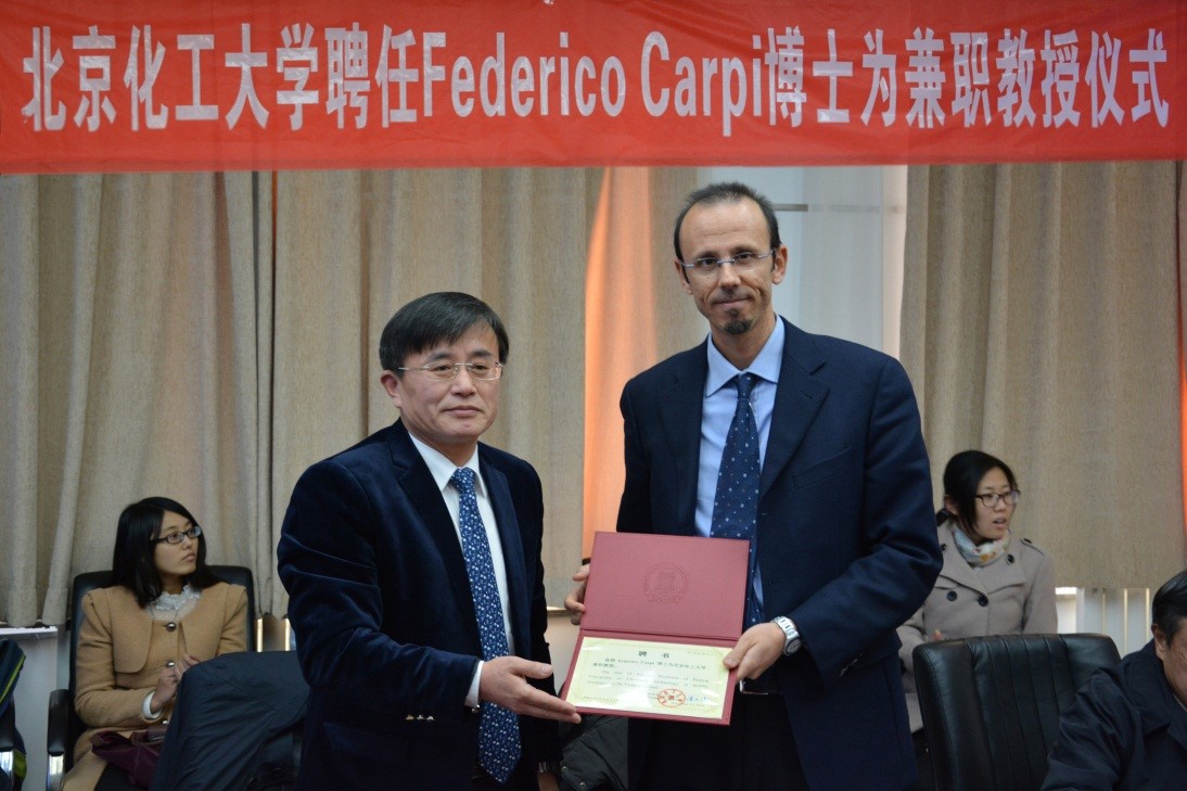 聘任仪式由田明教授主持。杨万泰院长介绍了Federico博士的履历和主要研究成果。王峰副校长为Federico博士颁发兼职教授聘书,学生代表献花并佩戴校徽。王峰副校长代表北京化工大学对Federico博士聘任为我校兼职教授表示热烈欢迎和祝贺,并希望Federico博士加强与我校的学术交流与合作,实现优势互补、合作共赢。Federico博士对受聘为北京化工大学兼职教授感到非常荣幸,希望能够为北京化工大学做出实质贡献。