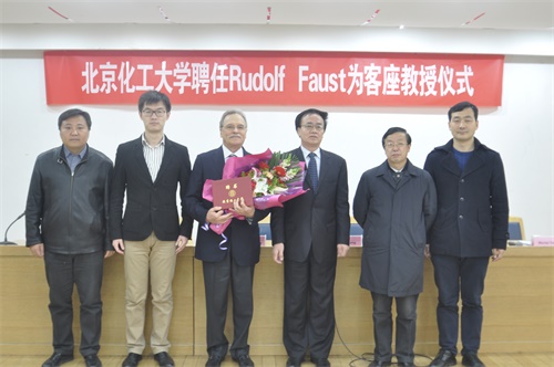 杨万泰院长向在座师生介绍了Rudolf Faust教授的履历及在活性聚合、生物材料等方面的研究成就,王贵副校长为Rudolf Faust教授颁发了北京化工大学客座教授聘书,学生代表为Rudolf Faust教授献花并佩戴校徽。随后,王贵副校长代表学校对Rudolf Faust教授受聘为我校客座教授表示热烈欢迎,他高度评价了Rudolf Faust教授在高分子材料领域取得的成就,相信Rudolf Faust教授的加盟会带来更多与材料学院教授合作交流的机会,进一步促进我校高分子材料的发展与壮大,并希望Rudolf Faust教授为学校在人才培养和科学研究等方面作出指导。Rudolf Faust教授发表讲话,他表示自己能够被授予北京化工大学客座教授称号深感荣幸,他表示一定会与材料学院的老师加强合作,不断促进马萨诸塞大学罗威尔分校与北京化工大学的交流与合作,为北京化工大学的材料学科发展尽自己的一份努力。