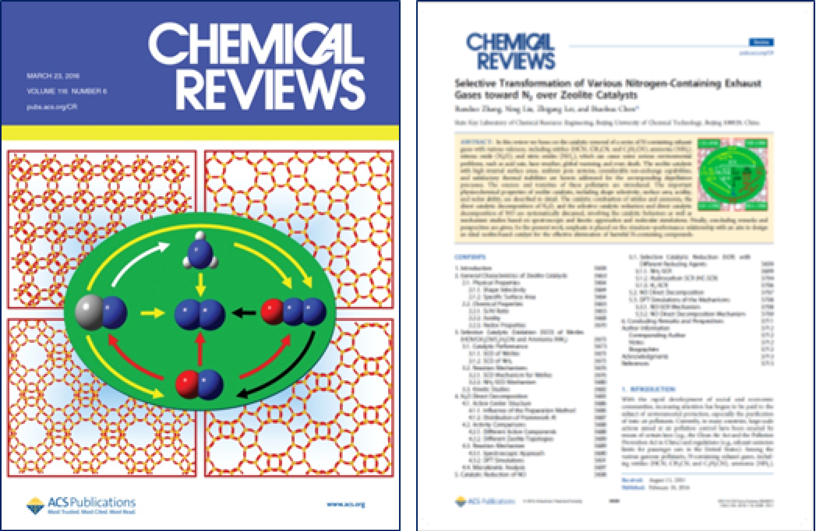 近日,化学工程学院张润铎教授和陈标华教授应邀在《Chemical Reviews》上发表题为“Selective Transformation of Various Nitrogen-containing Exhaust Gases towards N2 over Zeolite Catalysts” (Runduo Zhang, Ning Liu, Zhigang Lei, Biaohua Chen*, 2016, 116, 3658-3721)的综述文章,该杂志为美国化学学会旗下的顶级期刊综合版,属于化学/化工领域最具影响力的学术期刊之一,2015年影响因子达46.568,在全部SCI期刊中名列第三位。