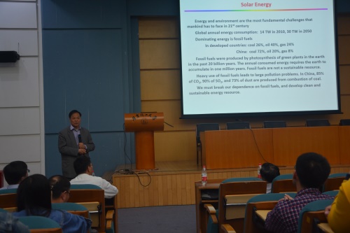 报告会前,谭天伟校长介绍了佟振合教授的简历,随后佟教授用朴实亲切的语言深入浅出地讲述了“太阳能催化分解水制得氢气”方面的研究历程。他分析了当前世界能源的形势,指出地球的非再生能源日益锐减,新的可再生能源的开发和利用逐步成为研究热点。太阳能作为一种可持续的稳定的清洁能源,其开发前景十分广阔。佟振合教授重点介绍了太阳能分解水的策略:使用半导体作为单一光敏剂和使用包括铁氢化酶在内的双光敏剂,具体讲解了太阳能的转换效率、光量子产率及光催化的稳定性。他从太阳能转化成热能、电能、生物质能、化学能等四个方面阐释了太阳能资源开发利用的成果,并和大家分享了自己在太阳能光催化分解水制取氢气方面多年的研究心得与最新进展。佟振合教授结合生活实例,把深奥的知识简单化,使高深的科学走进学校、走进学生。