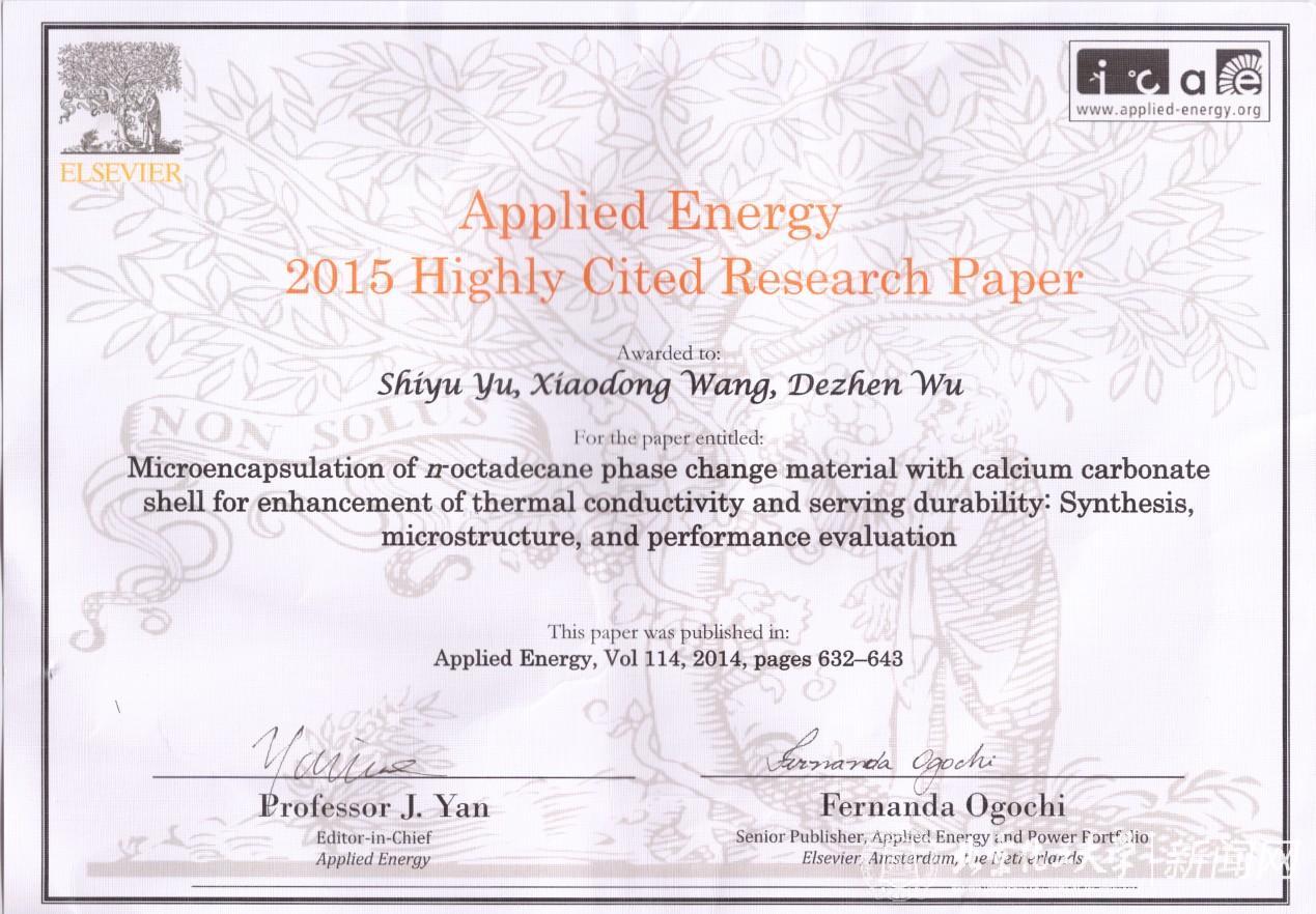2014年,汪晓东教授指导的硕士生于诗宇撰写了一篇学术论文(题目:Microencapsulation of n-octadecane phase change material with calcium carbonate shell for enhancement of thermal conductivity and serving durability: Synthesis, microstructure, and performance evaluation),并以第一作者在Applied Energy期刊发表(合作者:汪晓东通讯作者、武德珍)。经过引用统计,该论文被SCI引用论文引用高达55次;EI引用论文引用高达60次。Elsevier出版公司和Applied Energy期刊鉴于其突出贡献,特发此荣誉奖项。