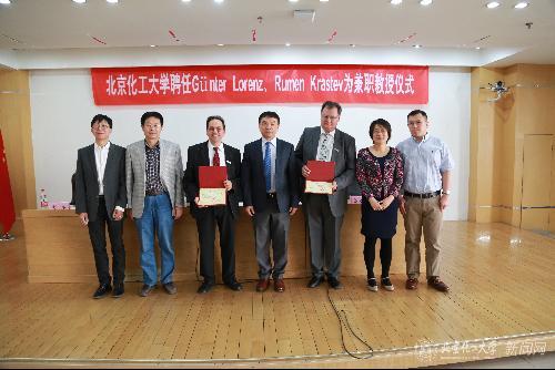 4月24日上午,北京化工大学聘任德国劳特林根应用技术大学应用化学学院院长Günter Lorenz教授和Rumen Krastev教授为兼职教授仪式在图书馆多功能厅举行。党委副书记兼副校长任新钢出席聘任仪式,人事处处长姜广峰、侯德榜工程师学院院长苏海佳、图宾根大学自然与医学科学研究所熊昕博士、生命科学与技术学院刘珞博士及侯德榜工程师学院的相关工作人员参加了仪式。