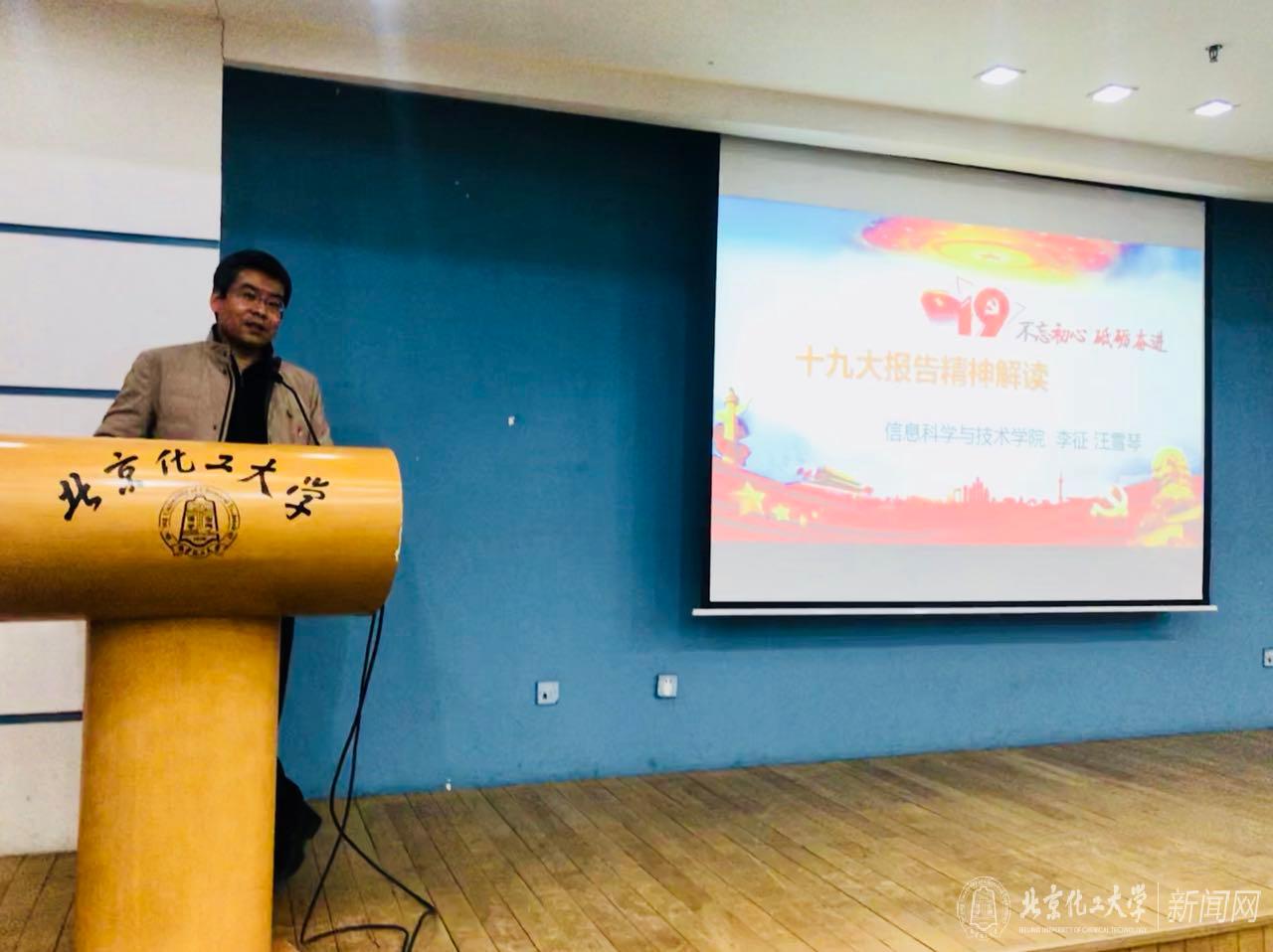为贯彻落实学习十九大精神,12月22日晚在图书馆中心会议室,信息学院分党委书记李征走上讲台、讲党课,为全体研究生党员及入党积极分子做十九大精神解读。