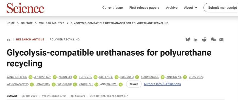北化新闻网10月31日电 近日,吴边/崔颖璐团队在《科学》(Science)杂志发表题为”Glycolysis-compatible urethanases for polyurethane recycling“的研究论文。研究团队借助人工智能驱动的微生物酶资源挖掘策略,成功发现了一种新型脲酶AbPURase。该酶具有优异的有机溶剂耐受性,在高浓度醇解反应介质中仍能保持极高催化活性与稳定性,与工业聚氨酯醇解工艺高度兼容。这一成果首次实现了在工业条件下聚氨酯的规模化生物解聚,为聚氨酯塑料的绿色循环利用提供了高效、可持续的新路径。