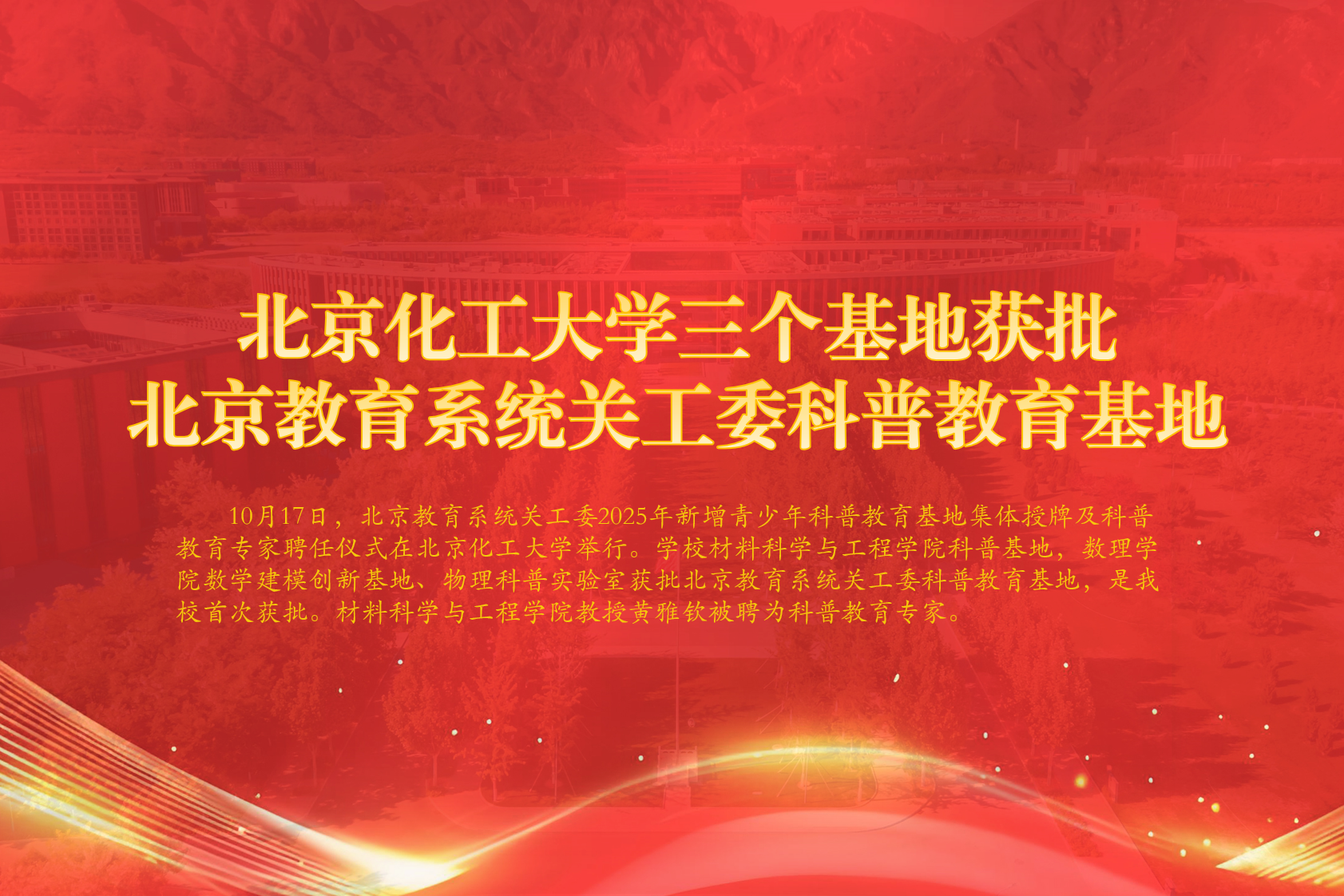 10月17日,北京教育系统关工委2025年新增青少年科普教育基地集体授牌及科普教育专家聘任仪式在北京化工大学举行。学校材料科学与工程学院科普基地,数理学院数学建模创新基...